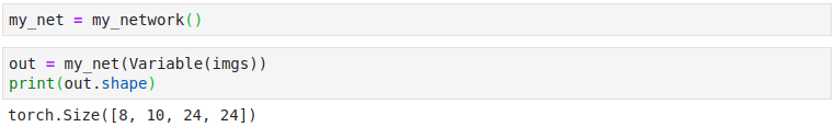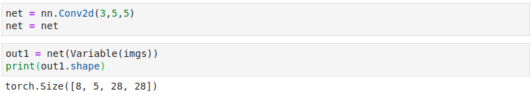 그리고 nn.Conv2d에서 input_channel, output_channel, kernel_size를 입력해줍니다. 그리고 out1에 imgs를 Variable로 감싸고 네트워크 안에 넣은 것을 선언해줍니다. out1의 shape를 보면 8, 5, 28, 28이 나왔습니다.