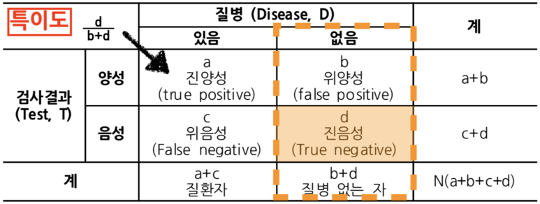 - 특이도 : 질병이 없는 환자 중 검사결과가 음성으로 나타날 조건부 확률
