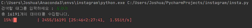 tqdm 라이브러리를 사용하여 진행상황을 실시간으로 확인할 수 있도록 하였습니다. 30분 정도 진행했을 때 전체 15%의 태그가 수집되었습니다. 상당히 오래걸립니다. 전체를 다 수집하는데 약 3시간 30분 소요될 것으로 예상됩니다.
