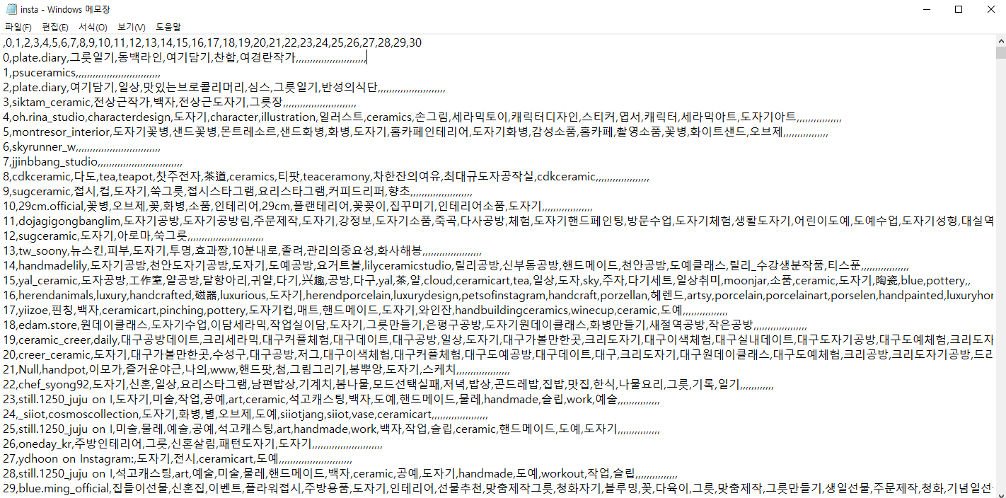 마지막으로 pandas를 이용하여 txt파일로 저장합니다. '도자기'라는 키워드로 검색한 경우