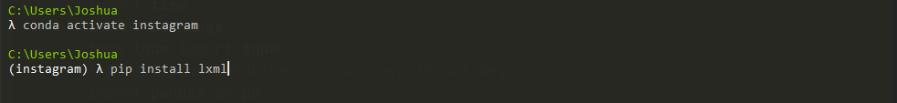 크롤링을 진행하기전 필요한 패키지를 설치해줍니다. 우선 CMD 창에서 생성하였던 instagram 가상환경을 activate해줍니다.
