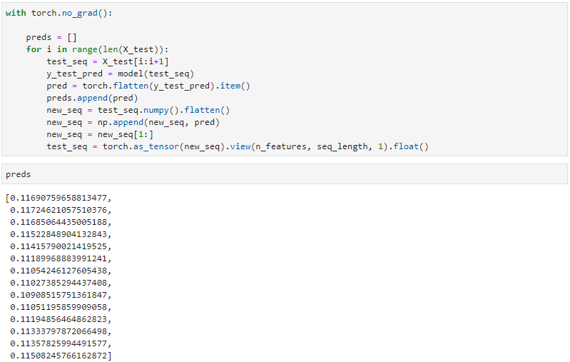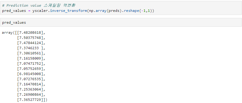 다음 코드를 통해 X_test 값을 모델에 넣어 예측값 preds를 산출해봅니다. 소수점의 결과값들이 나오는데 이건 위에서 데이터를 스케일링 해줬기 때문입니다.