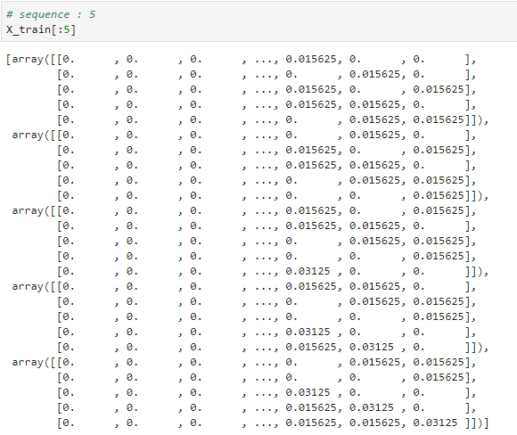 위의 예시는 함수를 사용하여 데이터를 시퀀스형태로 만든 모습입니다. 5개 씩 한 시퀀스로 묶었을 경우입니다. X_train을 보면 한 1개의 array에 5개의 데이터가 들어가 있습니다. 쉽게 말하자면 1월 22일 부터 1월 26일까지의 X 데이터가 하나로 묶여서 모델로 들어가는 구조입니다. 이러한 시퀀스 형태로 만드는 이유는 시계열 데이터의 순서를 학습시키기 위함입니다.