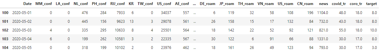 예측 모델링에 사용할 Input Data는 2020년 1월 22일 부터 2020년 5월 5일까지의 총 105개의 관측치와 84개의 컬럼으로 구성된 데이터입니다. 데이터는 다음과 같이 구성됩니다.