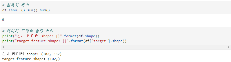 다음은 데이터의 결측치와 데이터 shape를 확인해줍니다. 102개의 row와 332개의 컬럼으로 구성되어있습니다.