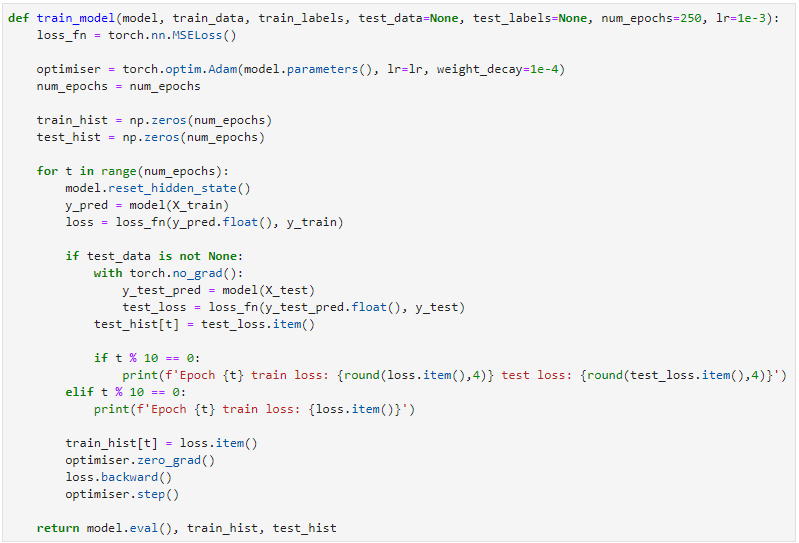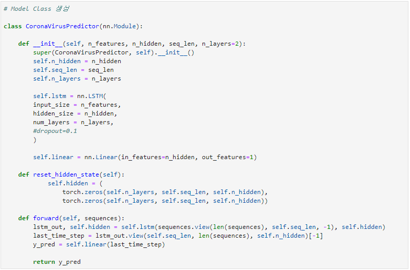 이제 모델을 생성해보겠습니다. 모델은 상당히 간단합니다. 크게 LSTM과 Linear로 구성되어있고 num_layers로 레이어층의 갯수를 설정할 수 있도록 하였습니다. 데이터가 적고 딥러닝 모델의 크거나 깊지 않으므로 dropout은 따로 주지 않았습니다.