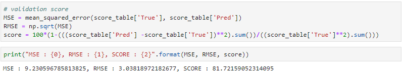 이번에는 평가지표로 성능을 살펴보겠습니다. MSE와 RMSE를 생성하였습니다 score는 실제값과 예측값의 차이가 작을 수록 100에 가까워지는 점수입니다. 이 모델은 81점 짜리 모델이군요 ㅠㅠ