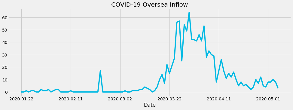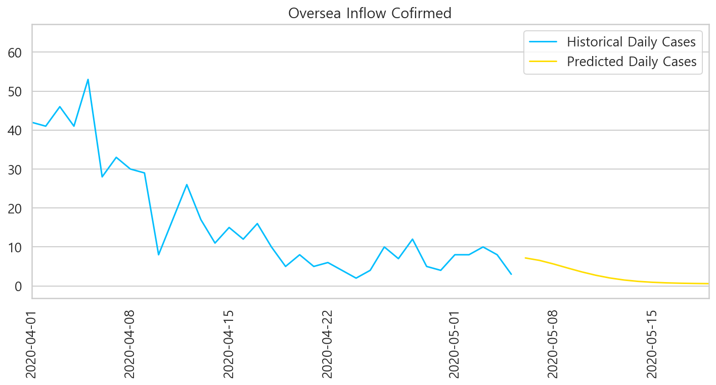 해외유입확진자에 대한 시계열(Time-Series) 데이터를 사용하여 예측 모델을 만듭니다. 이를 통해 가까운 미래에 발생하는 해외유입 사례를 예측합니다. 14일의 미래값을 예측하는 것이 프로젝트의 목표입니다.