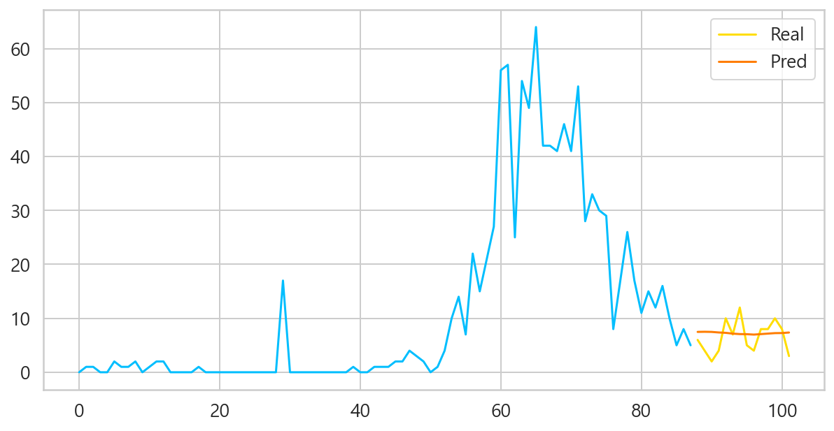실제값과 예측값을 전체그래프를 통해 시각화해봤습니다. 노란선이 실제값이고 빨간선이 예측값입니다. 실제 해외유입확진자의 경우에는 일일별 굴곡들이 있는 것을 볼 수 있지만 모델은 이러한 디테일까지는 잡지 못한 것 같습니다.