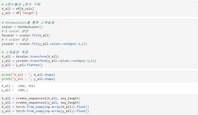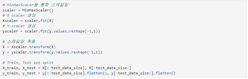 다음은 X, y에 스케일링을 해줍니다. Scikit-learn의 MinMaxScaler를 사용합니다. 스케일된 데이터를 추후에 다시 inverse scale 해주기 위해 X 데이터와 y데이터 각각 스케일러를 만들어 적용해줍니다. 그 후에 train / test 셋을 구분합니다. 밑에 나올 lstm sequence를 만들어주기 위해 y데이터를 flatten()하여 차원을 줄여줍니다.
