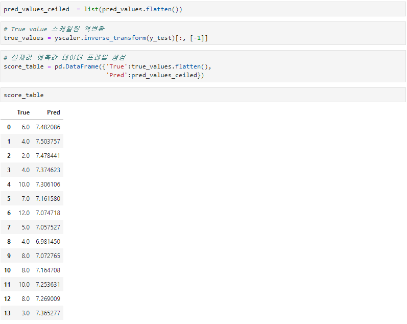 실제 y값 'True'와 모델로 부터 나온 예측값 'Pred'로 구성된 score_table을 생성하였습니다. 저 값들은 4월 22일 부터 5월5일까지의 실제값과 예측값입니다. 눈으로 대략적으로 살펴보면 예측값이 거의 단일 값이라서 그런지 생각보다 잘 맞추지는 못하는 것 같습니다.