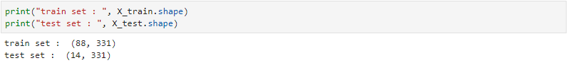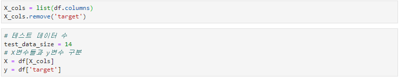 X변수와 y변수를 구분해줍니다. target(해외유입확진자) 변수를 분리하여 y로 지정해주고 나머지 변수는 X로 지정해줍니다. test set의 사이즈는 14로 지정해줍니다. 보통 7:3 정도로 train / test set을 나누지만 2주의 예측값을 산출하는 것이 목표이고 데이터가 적기 때문에 14로 지정하였습니다.
