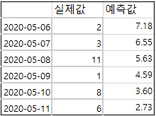 예측값을 스케일링을 역변환하여 결과를 확인해봅니다. 대략 6~7명 정도의 해외유입확진자가 나올 거라고 모델이 예측을 해줬습니다. 그럼 실제값과 한번 비교를 해보겠습니다.