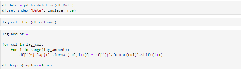 각 변수들에 3개의 시차 변수를 만들어 주고 Lag 생성으로 인한 na 값은 row를 통채로 날려줍니다.