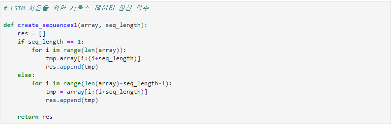 위의 함수는 모델 안에 들어갈 데이터를 시퀀스 형태로 만들어 주기 위한 함수입니다.