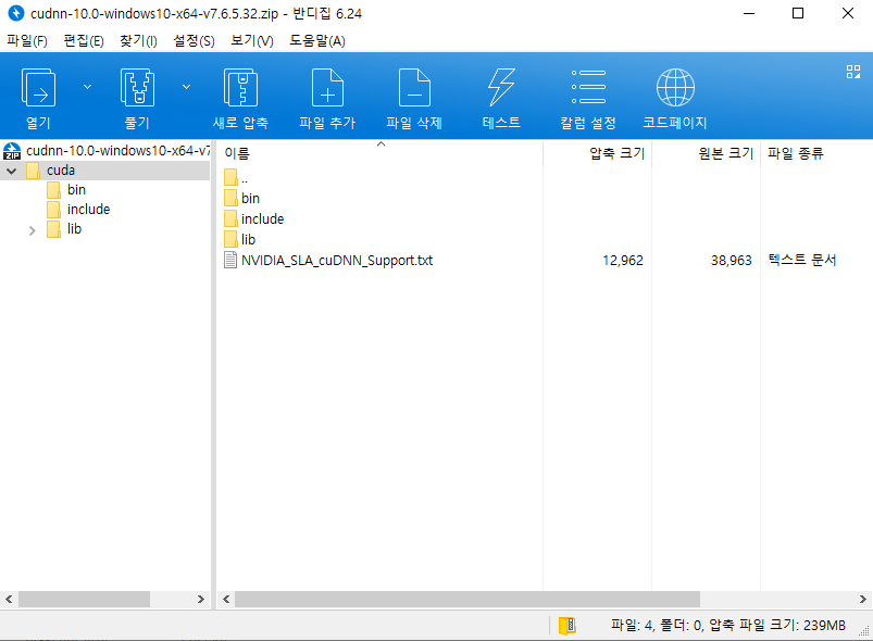 우선 바탕화면 등에 압축을 해체하여 저장합니다. 압축을 해제하면 다음과 같은 화면이 나옵니다. bin, include, lib, NVIDIA_SLA_cuDNN_Support 까지 총 4개의 파일이 있는데 CUDA Toolkit이 설치된 폴더에 복사 붙여넣기를 해주면 됩니다.