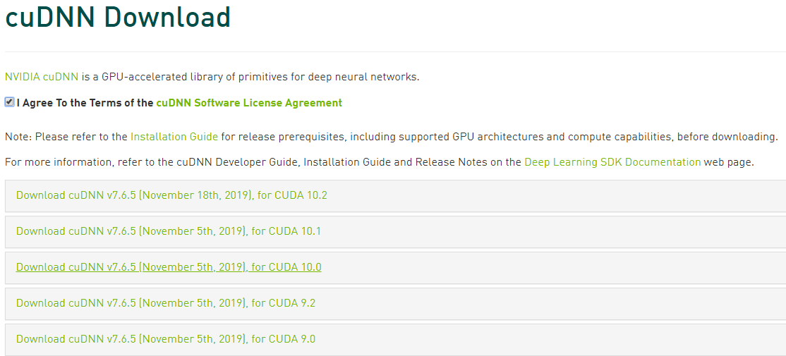 로그인을 하고 Agree 버튼을 체크하면 다음과 같이 다운로드 받을 수 있는 목록들이 나옵니다. 저는 cuda 10 버전을 설치했기 때문에 호환이 되는 cuDNN v7.6.5 for CUDA 10.0 버전을 다운로드 받았습니다. 목록에서 원하는 버전을 누르면 자신에 컴퓨터 환경에 맞게 고를 수 있는 목록이 나타납니다. 해당 파일을 다운로드 받으면 zip 파일로 받아지게 됩니다.