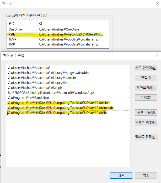 시스템 환경 변수 편집 - 고급 탭 - 환경 변수(N)... 으로 들어간뒤 시스템 변수를 확인해보면 CUDA_PATH와 CUDA_PATH_V10_0이 있는 것을 확인 할 수 있다. 이렇게 나온다면 정상적으로 CUDA 설치가 완료 된 것이다.