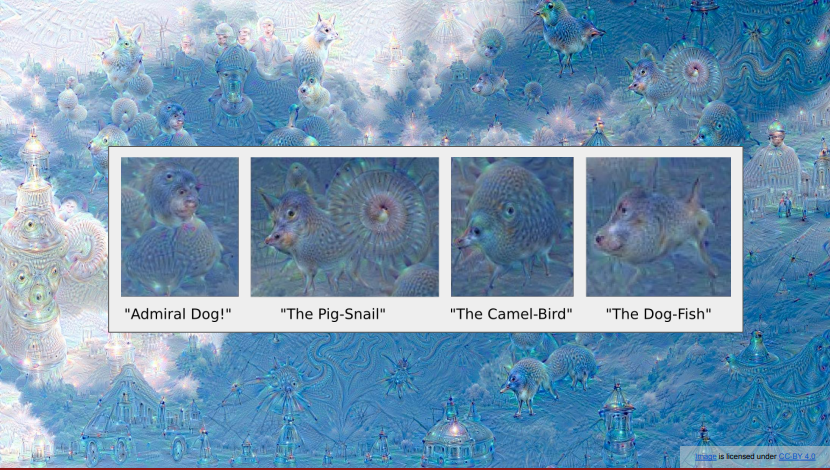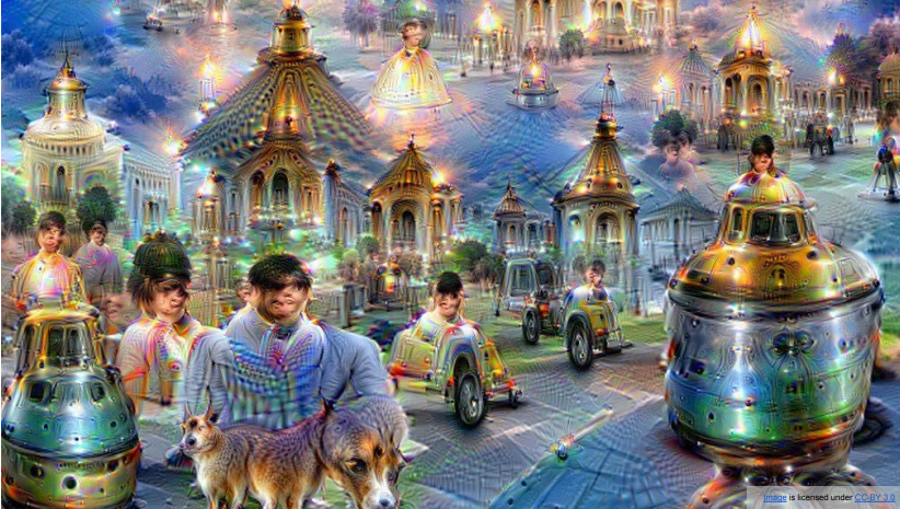 다음은 DeepDream이라는 알고리즘인다. 앞서서 했던 convnet을 통해 특징점을 추출하고 최대화하여 시각화하는 것을 적용하여 하늘 이미지에서 특징점을 추출하고 그것을 이미지에 계속 반복적으로 합성을하는 작업을 하게되면 이러한 결과가 나타난다. 이미지에 이상한 생명체들이 나온 이유는 사용한 가중치 값이 imageNet 등의 데이터 셋의 학습된 weights를 사용했기 때문으로 보인다.