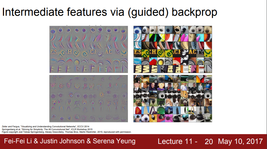 Gradient Ascent라는 방법을 사용하여 이미지를 시각화하는 방법도 있다. 앞서 나온 backprop과 함께 사용한다. 우리가 CNN을 사용하면서 학습한 weight는 고정시켜놓고, backprop을 사용하여 중요한 특징점을 찾고 gradient ascent를 사용해 그 부분을 극대화하여 이미지를 시각화하는 것이다.