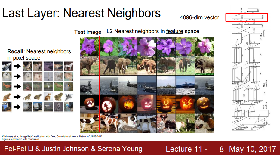 마지막 레이어를 보면 4096 차원의 벡터로 이미지들이 변환되고 벡터를 Nearest Neighbors를 통해 벡터들의 거리를 계산한다.