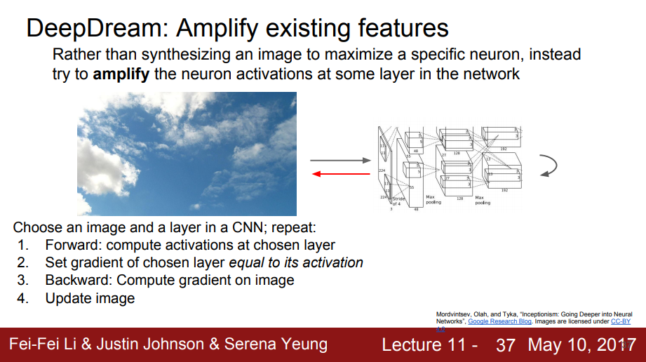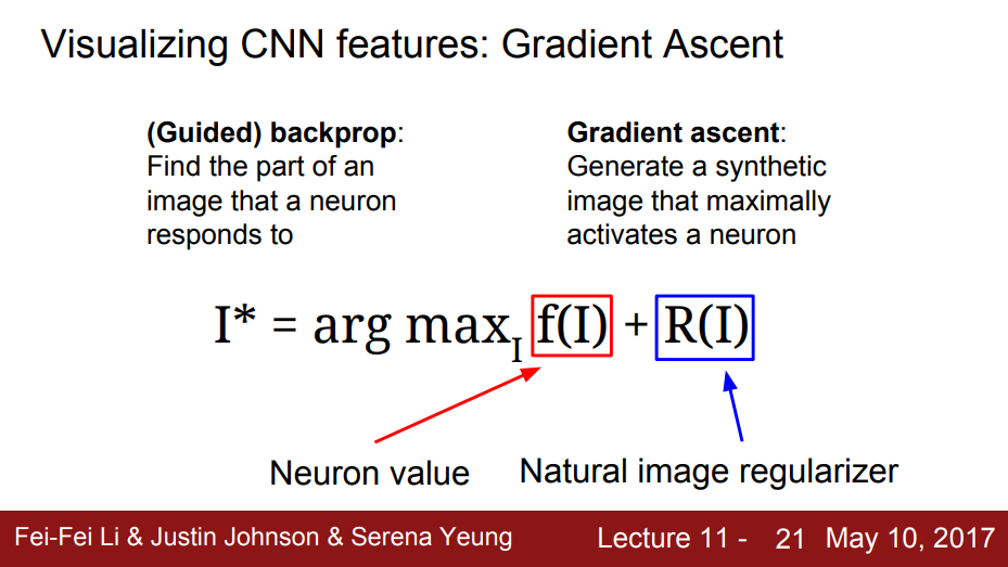 Gradient Ascent를 통해 이미지 안의 픽셀을 NN의 중간이나 클래스의 점수를 통해서 최대화하는 것이다.