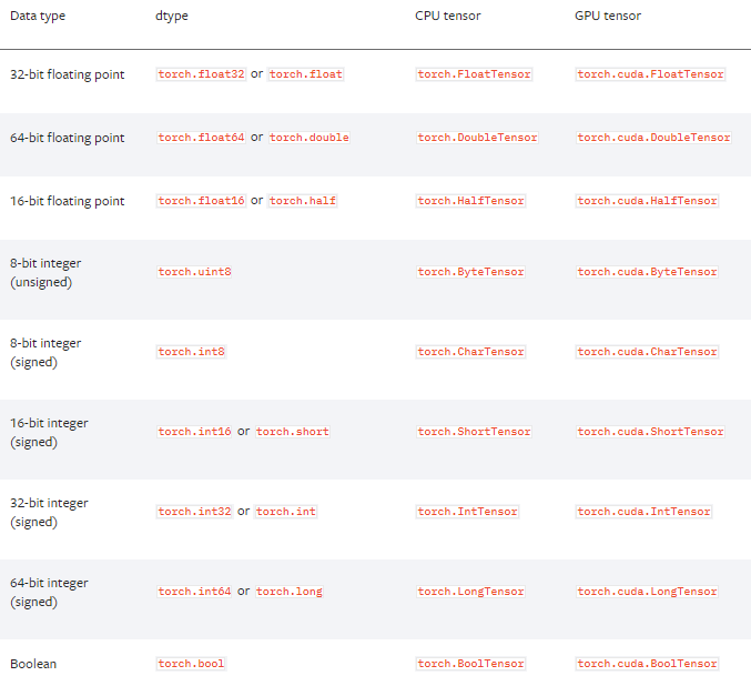 텐서에는 다양한 종류가 있으며 GPU를 사용해서 텐서를 선언했을 경우에는 dtype이 torch.cuda.Tensor 형식으로 나오게 된다.