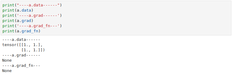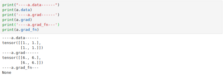 out.backward()를 수행하게 되면 grad가 변경된다. grad_fn이 None으로 나오는 이유는 a가 직접적으로 수행한 연산은 없기 때문에 None으로 나타나는 것이다. gradient를 계산할 함수가 없기 때문이다.