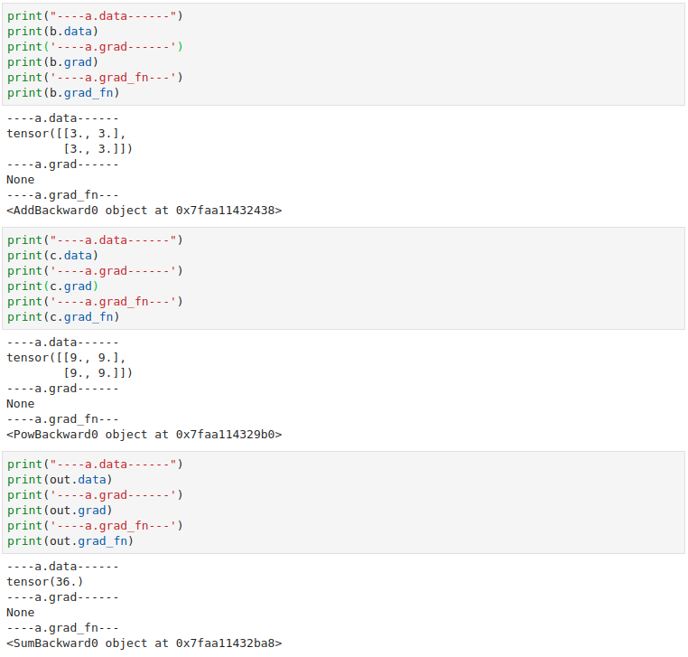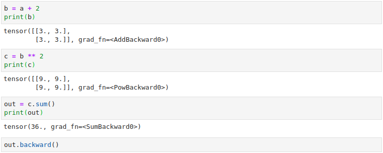 c에 대한 것을 보면 grad_fn이 PowBackward0로 되어있고 out의 grad_fn은 SumBackward0으로 나타난다. c는 제곱이였고 out은 sum이기 때문에 위와 같이 나타나는 것이다.